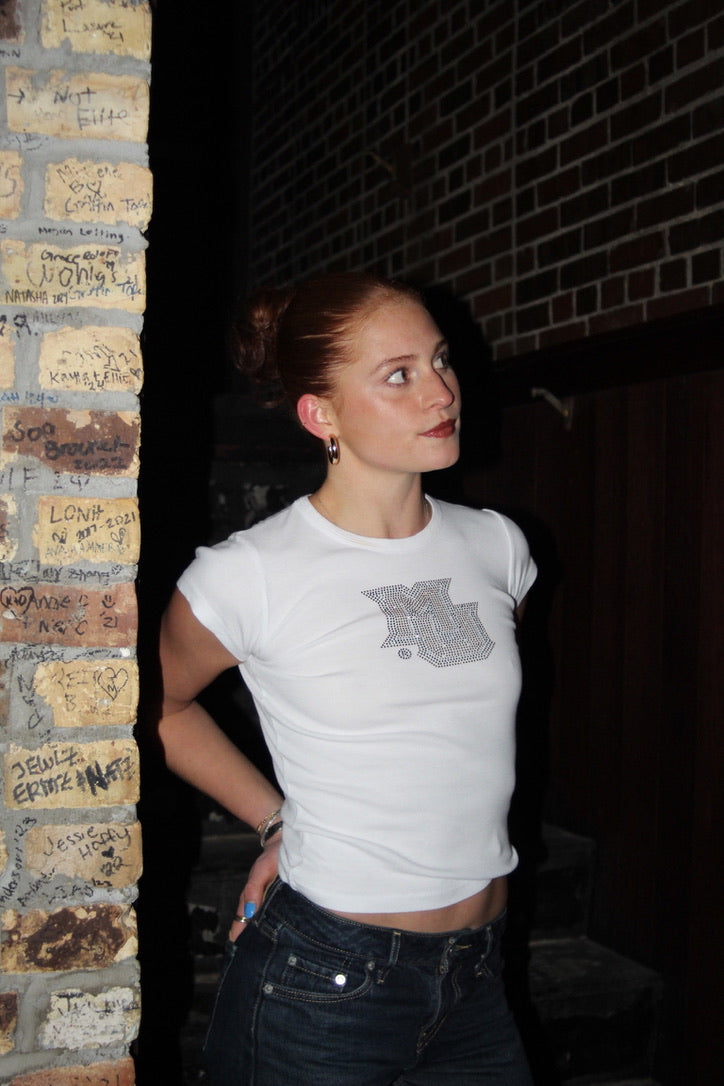 Get ready to show off your Michigan pride with our Rhinestone Heritage Tee. Made from a soft 100% cotton. Our heritage tee is form fitting and hip length making it the perfect pairing for low rise jeans.  This rhinestone design that will surely catch everyone's attention.